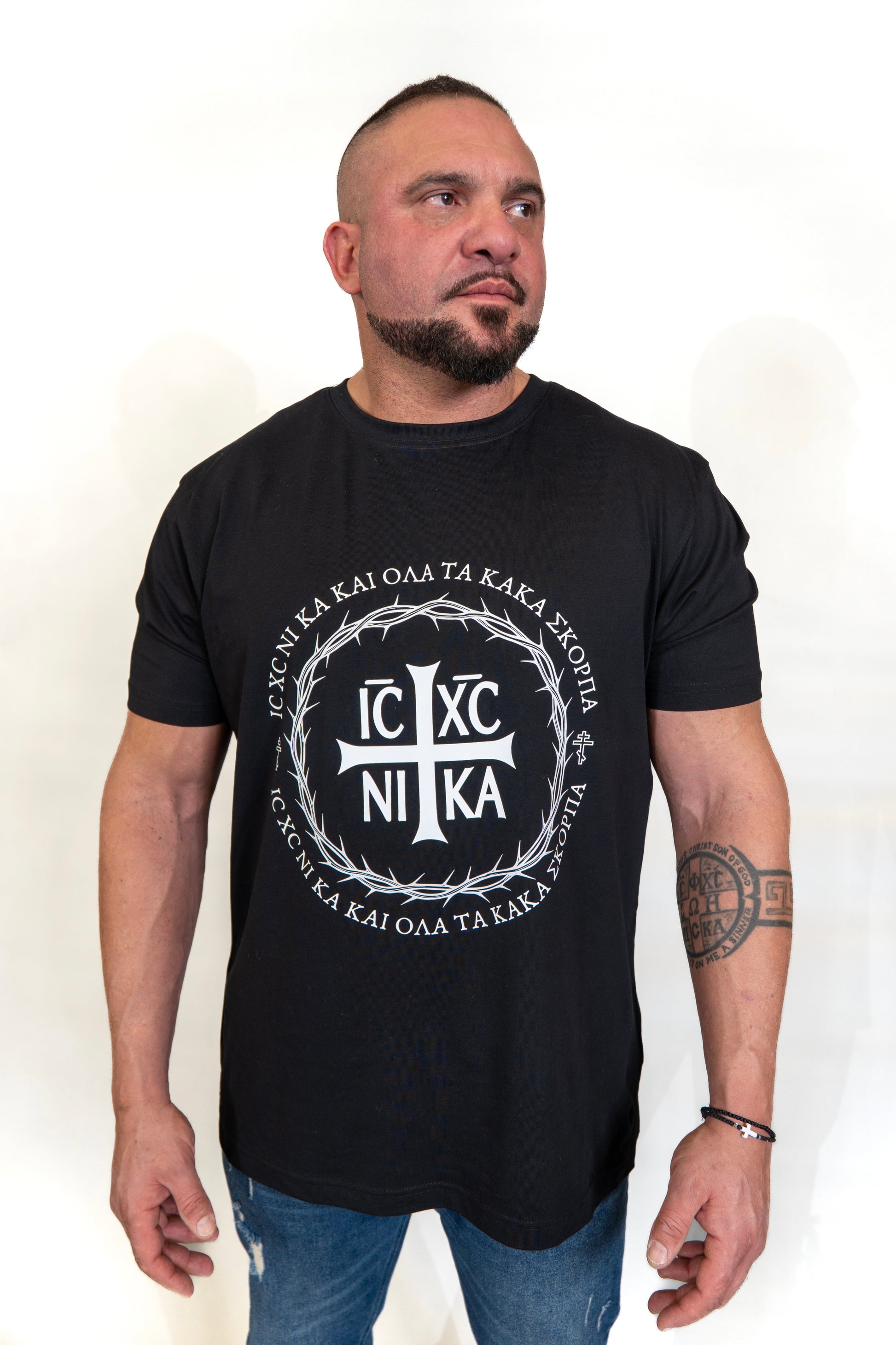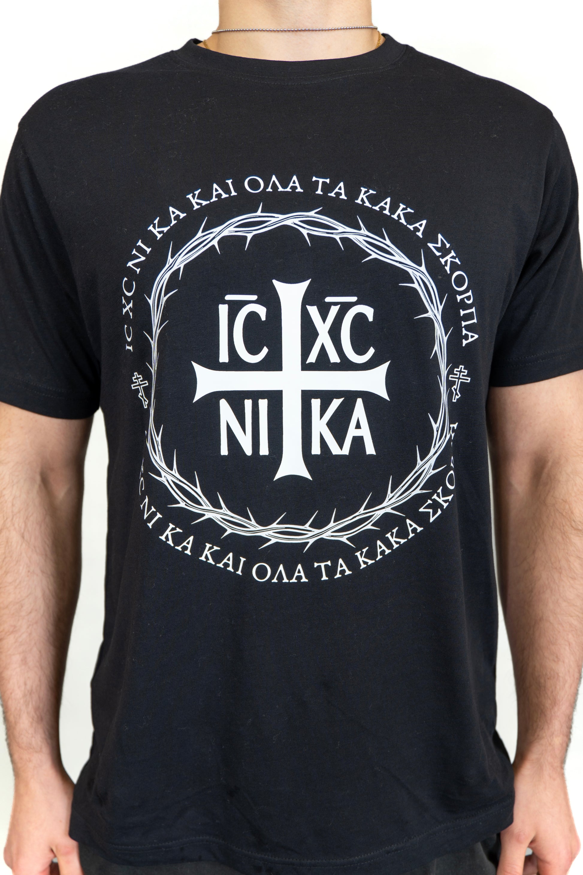 This design contains the Greek prayer ‘IC XC NIKA kai ola ta kaka skorpa’, which translates to ‘Jesus Christ conquers and scatters all evil.'